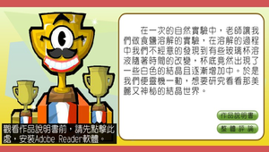 本單元透過動畫的引導認識物質的溶解,探討水溶液的種類,認識各項溶解的應用,同時以動畫來呈現其物質溶解發生的來源、過程和結果,讓學生有初步的粒子分散觀念,並且從中理解溶解度與濃度等概念;並設計了「你溶我不溶」、「美麗的結晶」、「彩色溶液」、「吹泡泡」等實驗提供學生模擬試驗的機會。