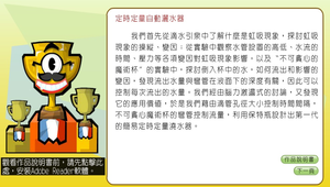 本教學單元運用情境故事引發學生對於時間這個主題的興趣。單元中透過古今中外各種計時器的介紹,使學生由早期的線香、日晷、水鐘、沙漏等計時器、近代的機械時鐘,至現代各式計時器的原理與應用,了解時鐘的概念與構造。在科學原理的探究與動手做方面,本單元藉由探究實驗、虛擬實驗與多元評量等活動,讓學生學習流體力學的概念,並能瞭解水鐘的原理與製作的技巧。透過本單元各模組的教學內容,學生除了對時鐘有了進一步的認識外,也有機會從中瞭解科技的演進過程以及科技與當代的科學發展、社會文化之間的關係。