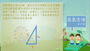 本學習單元先從幾何與代數的角度介紹商高定理後,讓學生從證明的探究過程更深入的瞭解商高定理,最後讓學生將此定理應用於日常生活中。