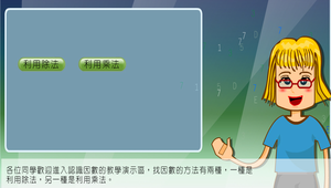 本學習單元適合國小五、六年級學生自我學習,與國一學生複習;利用乘法和除法的方式,說明因數的意義,讓學習者了解尋找因數的方法,教師亦可利用其中的評量或是探究實驗測試學生學習狀況。