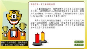本單元以能源危機為引言,帶入環保的觀點以說明新興能源的科技原理與社會意義。其中以生活化的花生油、爆米花等實驗,引起學生的學習動機,再加入乾餾等化學實驗,讓學生能從中學習能源產生的原理與應用。