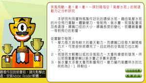 本學習物件主要為水火箭的製作與教學活動,內容包含了MST(數學、科學、科技)三種不同的知識,可以讓使用者同時運用三種知識來製作出飛行最遠、最準的水火箭。