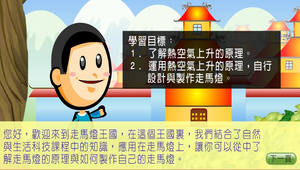 本學習物件主要是從熱空氣和摩擦力的原理來教學生,並且有模擬和詳細的步驟來製作走馬燈。也有走馬燈詳細的各部位名稱可以學習。學習結束後,也可利用有趣的評量來測驗自己學習的成果。