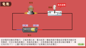 本單元在認識各種簡單電路,由斷路、通路、短路現象呈現進一步到串聯並聯的認識,接著配合畫面上的伏特計、安培計、電池及燈泡學習電壓及電流的測量,再配合電阻深入到歐姆定律的認識與應用。本學習單元適合國小四年級至國中三年級學生對基本的簡單電路認識與自我學習使用,教師亦可在教學中運用此單元內容進行教學與評量。