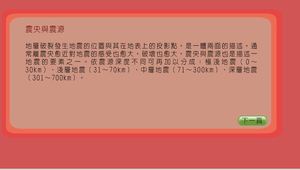 本單元介紹自然界災害之ㄧ:地震。說明地震的發生原因與描述地震的幾個名詞:震源、震央、震度、規模等。通常與地震一同發生的斷層,也一併介紹,最後再說明地震發生所產生的災害與防護方式。適合國中以上學生自我學習,小學四、五年級由教師教導較為恰當。教師亦可運用此單元內容進行教學與評量。