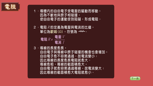 本單元在認識各種簡單電路,由斷路、通路、短路現象呈現進一步到串聯並聯的認識,接著配合畫面上的伏特計、安培計、電池及燈泡學習電壓及電流的測量,再配合電阻深入到歐姆定律的認識與應用。本學習單元適合國小四年級至國中三年級學生對基本的簡單電路認識與自我學習使用,教師亦可在教學中運用此單元內容進行教學與評量。