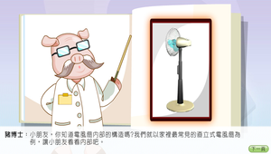 本學習物件主要是由科學原理讓學生了解電風扇的原理,再利用虛擬實驗讓學生學會扇葉數量、面積與風力的關係,並從中了解電流、馬達的配合。