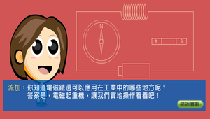 本單元從電磁鐵和一般磁鐵的不同說起,讓學生了解電磁鐵的特性。並由電鈴、電磁鐵釣魚竿及旋轉娃娃單槓翻滾等實驗,讓學生了解電磁鐵的磁性的性質。本學習單元適合國小一至六年級學生自我學習,教師亦可在教學中運用此單元內容進行教學與評量。