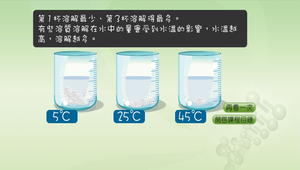 本單元透過動畫的引導認識物質的溶解,探討水溶液的種類,認識各項溶解的應用,同時以動畫來呈現其物質溶解發生的來源、過程和結果,讓學生有初步的粒子分散觀念,並且從中理解溶解度與濃度等概念;並設計了「你溶我不溶」、「美麗的結晶」、「彩色溶液」、「吹泡泡」等實驗提供學生模擬試驗的機會。