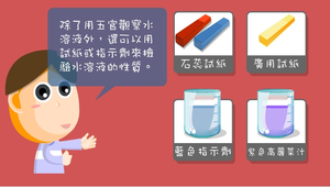本單元透過動畫的引導來探討水溶液的性質、指示劑與試紙以及學習檢驗水溶液的性質,接著認識水溶液的導電性及酸與鹼的應用。實驗設計有「常見的水溶液」、「自己做指示劑」、「酸鹼中和」、「蘋果變紅了」、「無字天書」等實驗提供學生模擬試驗的機會,讓學生從有趣的實驗出發,進而理解實驗內容的關鍵概念。