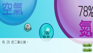 本單元透過動畫介紹綠色植物行光合作用吸收二氧化碳、釋放氧氣的動畫來引導學習,進一步探討空氣的性質、成分,並且利用空氣中的氧氣,引導學生認識燃燒及燃燒的三要素並理解滅火的原理;從學生對氧和二氧化碳的認識,讓學生進一步學習如何製造氧氣及二氧化碳。實驗設計有「失火了」、「美麗的火焰」、「簡易滅火器」、「放天燈」等實驗,讓學生能將學習與生活經驗連結。