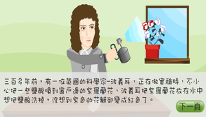 本單元透過動畫的引導來探討水溶液的性質、指示劑與試紙以及學習檢驗水溶液的性質,接著認識水溶液的導電性及酸與鹼的應用。實驗設計有「常見的水溶液」、「自己做指示劑」、「酸鹼中和」、「蘋果變紅了」、「無字天書」等實驗提供學生模擬試驗的機會,讓學生從有趣的實驗出發,進而理解實驗內容的關鍵概念。