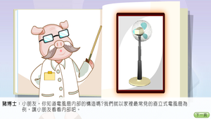 本學習物件主要是由科學原理讓學生了解電風扇的原理,再利用虛擬實驗讓學生學會扇葉數量、面積與風力的關係,並從中了解電流、馬達的配合。