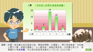 本單元包含有適合小學一年級到六年級學生程度的學習,本單元透過故事人物的對話,說明統計單元中的平均數、眾數、中位數等概念,並輔以動態畫面的呈現,以日常生活的實例,做為內容的主題,藉由視覺化強化學生對統計單元的了解與認識,協助學習者在本單元內容的學習。