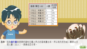 本單元包含有適合小學一年級到六年級學生程度的學習,本單元透過故事人物的對話,說明統計單元中的平均數、眾數、中位數等概念,並輔以動態畫面的呈現,以日常生活的實例,做為內容的主題,藉由視覺化強化學生對統計單元的了解與認識,協助學習者在本單元內容的學習。