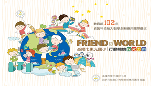 以「與世界為友」為主軸,運用FRIEND」教學模式設計進入情境學習,關懷社區與世界的單元課程,課程架構圖如下圖 4,計有 3 年級我居住的地方、4 年級 7-11 採購方案、5 年級美麗的星空,此三個方案均為走入社區情境學習之方案設計。6 年級為愛在全球-減碳小達人方案,以設計虛擬國際化情境讓孩子進入世界。在各年級方案周遭的圖示為該教學方案資訊科技運用的情形,計有單槍投影機、電腦教室的桌機、平板電腦、全區域無線網路等,六年級另使用 E-Class 學習平台,作為教學互動的工具。