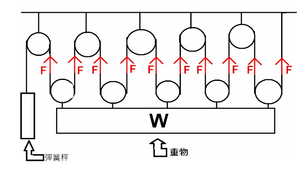 透過滑輪的架設,確認滑輪組唯一省力的裝置,若經過N組的滑輪組,則只需要花費 ( 1 / 2 ) × (總重 / N) 的力量,為各動滑輪所支撐物重的二分之一。