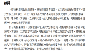 究不同豆類(綠豆、紅豆、黃豆)在校園內不同電磁波強度場所(不斷電供應器、冰箱、電源箱、實驗室)之成長狀況,並比較經過建材的阻擋後,電磁波變化情形及對於綠豆成長的影響。