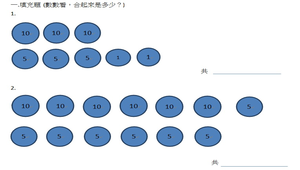學習內容:N-1-4 解題:1 元、5 元、10 元、 50 元、100 元。以操作活動 為主。數錢、換錢、找錢。