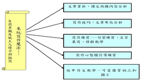 這幾課文章內容都是著重在介紹自然環境景觀,及活動參觀之五官摹寫及心情感受描寫。文章中針對當地最具特色的景觀及人文活動、鄉土民情做細緻的描述,讓讀者有身歷其境的感受。教學者希望學生透過此三課的學習可以模作,就以最熟悉的就讀國小作為寫作題材。