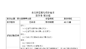 學習內容:N-4-5 同分母分數:一般同分母分數教學(包括「真分數」、「假分數」、「帶分數」名詞引入)。假分數和帶分數之變換。同分母分數的比較、加、減與整數倍。