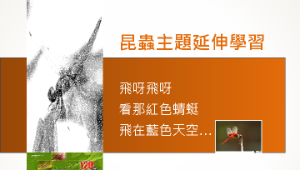 以簡報方式介紹昆蟲主題的延伸學習以蜻蜓為例,彙編網路以及書本等相關圖文資料,有系統的介紹不同的蜻蜓外觀特徵,讓學生認識處處可見的蜻蜓,並使學生對蜻蜓這種昆蟲有較親切的感覺