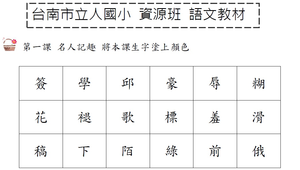 搭配第一課課生字,從學習單中將上到的生字,使用不同顏色的色鉛筆圈選或塗上顏色。下半部是檢測本課生字語詞學習成效。