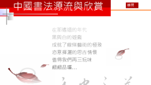 一、使用Powerpoint播放教材,逐步將中國書體的演進,以文字配合圖片,藉由各種動態呈現及選單式連結,引導學生欣賞各種書法字體,並鼓勵學生發表對書法的觀感。
