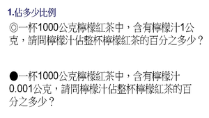 六年級數學科有「比率」單元,「部份量/總量=比率」此關係式的應用變化極多,特別式ppm的觀念及應用,學童在日常生活中不易經驗到,且ppm的計算通常較為複雜,故創作此簡報,頁數不多,但含蓋ppm應用的大部分類型,只要稍微修改數字,即可讓學童加強練習。