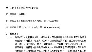 (一) 台灣的野生動物種類龐雜,資源豐富,有些種類甚至是全世界僅有在台灣才能看到的特有種類。但近年來由於人口激增與經濟開發,野生動物棲地的破壞, 加上不當的食補、放生、寵物觀念,衍生濫捕、濫抓現象及外來種入侵競爭等,使得野生動物數量急速減少,有些種類甚至瀕臨絕種。藉此教學活動喚起學生對瀕臨絕種或生存已遭危害動物的保育,以及對維護整個生態環境的重視。