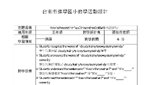1. Students recognize the words of “cloudy, rainy, snowy, sunny, windy.”學生能夠辨認cloudy, rainy, snowy, sunny, windy.單字。2. Students pronounce the words of “cloudy, rainy, snowy, sunny, windy.” correctly.學生能夠正確說出cloudy, rainy, snowy, sunny, windy.的發音。3. Students understand the sentences of “How’s the weather?” and ” It’s _____.”學生能夠聽懂的“How’s the weather?” 及” It’s _____.”句型。4. Students read the sentences of “How’s the weather?” and ” It’s _____.” correctly.學生會說“How’s the weather?” 及回答 ” It’s _____.”的句型。5. Students participate in the activities enthusiastically.學生能夠踴躍參加活動。