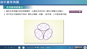 說明圓形在等角圖中是畫成橢圓形,以畫在內切於60°菱形之橢圓方法繪出。而不同之平面(正面、上面及側面)會有不同60°菱形之橢圓,再利用動畫呈現繪製橢圓的歩驟。