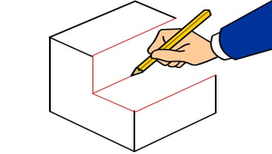方箱法(切割法) 提供2個不同圖形的畫法示範,先畫好物體之最大尺度之等角圖,再依特徵切割繪製。