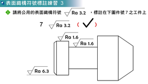 讓學生練習說明元件指定部位的表面織構符號標註位置,老師操作展示2D視圖參考答案,讓學生自我驗証作答,即時回饋。