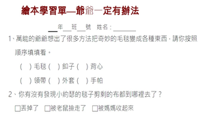 這張學習單適合低年級孩子使用,內含兩題閱讀理解的勾選題,以及一題開放性的問題,讓孩子在閱讀「爺爺一定有辦法」繪本後,可以自行發揮創意,畫出約瑟的毯子還可以變化成什麼東西