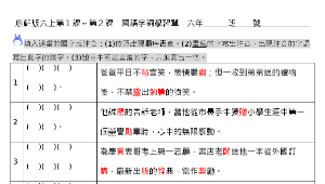 將1到2課之重要語詞以不同題目條列出來,讓學生精熟所該學會的國字及注音是否能確實應用在課文以外的情境中,也可當成學校定期評量前之複習。