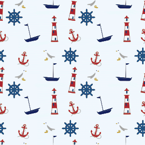 The image is a seamless pattern of sea-related things which include yacht,anchor,sea-bird,lighthouse and rudder.