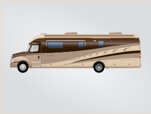 This rendering if based on a Class C motorhome that was in production. None of the names on the illustration nor the paint scheme are a direct copy of anything that is commercially available. The fictitious make is "Driveliner" and the model is called "Grand Ville". This vehicle is one of a set of motorhomes I have rendered.