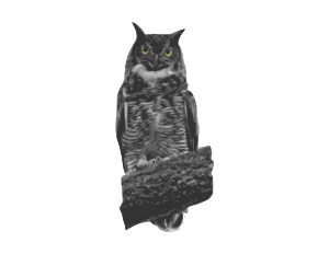 A Great Horned Owl, Bubo virginianus, on a tree limb, in B&W with spot color on the eyes, from original photo by nature photographer Stephanie Hazen.