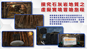 本教材旨在透過虛擬實境VR技術導入「探究石灰岩地質之虛擬實境冒險旅程」地理教材開發,透過VR沉浸式場景學習與操作,結合高雄在地石灰岩洞穴地形體驗,與傳統式截然不同的3D虛擬學習方式,有助於理解與認識地理課本上的活知識,激發學生學習興趣。