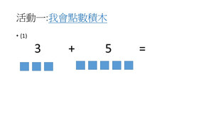 教材分析:先複習數的概念,在進行「單一積木點數」和「積木樹棒」進行加法發展活動,最後習寫學習單(分高低組),高組能完成畫圈圈或點數圈圈進行加法活動,低組在協助下能能完成蓋印章體會加法合起來概念。