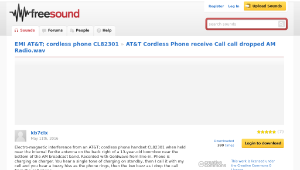 Electro-magnetic interference from an AT&T; cordless phone handset CL82301 when held near the internal Ferrite antenna on the back right of a 13-year-old boombox near the bottom of the AM broadcast band. Recorded with Goldwave from line-in. Phone is charging on charger. You hear a single tone of charging on standby, then I call it with my cell and you hear a buzzy hiss as the phone rings, then the low buzz as I drop the call from the cell phone.