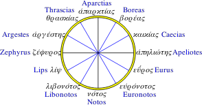 Depiction of an ancient Greek 12-wind compass rose, following the nomenclature of Timosthenes (c. 280 BCE, as reported by Agathemerus). For simplicity, this depiction assumes that winds are at 30-degree angles on a compass rose. Original public domain work by ElectroKid at http://commons.wikimedia.org/wiki/File:Greek_12-wind_rose.svg