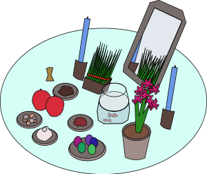 So first off, this is not my culture so if I messed up anything let me know! I wanted to make a "haft seen" (seven S's) table because the spring equinox holiday is coming up. Iran is part of the world, and I though this unique and interesting holiday needed more attention. It's sometimes called Iranian New Years and it has all sorts of events but this clipart represents a table set up with various symbolic elements. (This was a big openclipart.org gap I tried to fill---!)