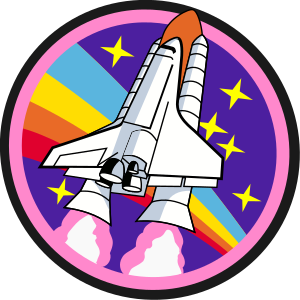 A round badge with a rocket blasting off, with a rainbow and stars.