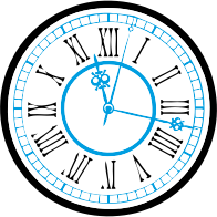 A circular clock with blue hour, minute and second hands.