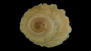 形態特徵:殼呈鈍三角形,殼底極寬。殼為黃褐色,殼表具波浪狀皺摺,及細密放射紋,周緣不規則或波浪狀。殼底淡褐色且光滑,臍孔大且明顯。口蓋角質,橢圓形。