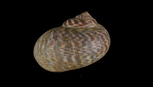 形態特徵:殼近橢圓形,質厚,殼頂高。殼外表為淺灰色到褐色的底,密佈深褐色的小斑點。臍孔小且深,臍盤白色。殼口半圓形,白色。口蓋石灰質,白色,半圓形,外緣有兩條螺溝。