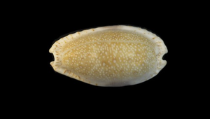 形態特徵:殼近橢圓形。殼表光滑,黃褐色底,密佈白色斑點,側邊滑層略向外延伸,具有短肋和褐色紋,兩側中央一深褐色斑,腹面白色。殼口的齒列白色,較粗,外唇齒列延伸到側邊。