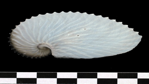 形態特徵:殼大形,質薄,鸚鵡螺狀,殼外表具有放射肋,與背脊相交處形成尖銳瘤突。殼為象牙白,放射肋周圍為淺褐色,殼面和背脊交接處為深褐色。